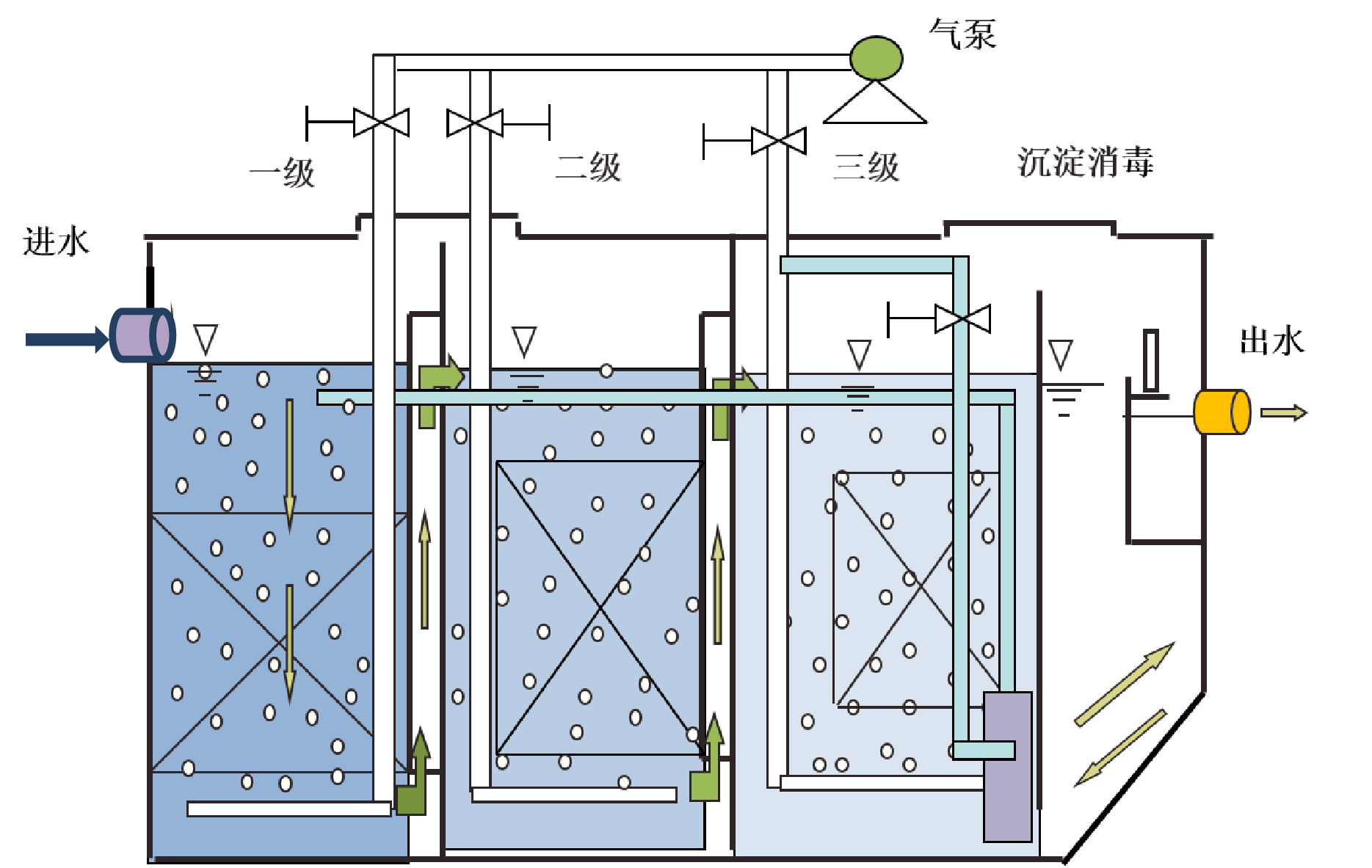 生態(tài)型污泥減量化的農(nóng)村生活污水處理一體化凈化槽,專利產(chǎn)品(zL2015109369603),材質(zhì)SMC(玻璃鋼)玻璃鋼結(jié)構(gòu),內(nèi)部分成四個區(qū)域,前三個區(qū)域可以根據(jù)實際處理水量,使用不同功率大小的氣泵,有閥門控制進(jìn)行曝氣或不曝氣操作,形成好氧區(qū)和厭氧區(qū),微生物有效地生長在各區(qū)域的載體上,不斷降解污水中的污染物。每臺凈化槽配置一臺氣泵,功率大小由處理污水量決定 ( 60W、80W、100W、120W、150W、175W 或200W )。一體化凈化槽就是一臺完整的污水處理系統(tǒng),可以單臺使用,也可以多臺串聯(lián)使用還可以并聯(lián)使用。產(chǎn)品壽命周期30年。